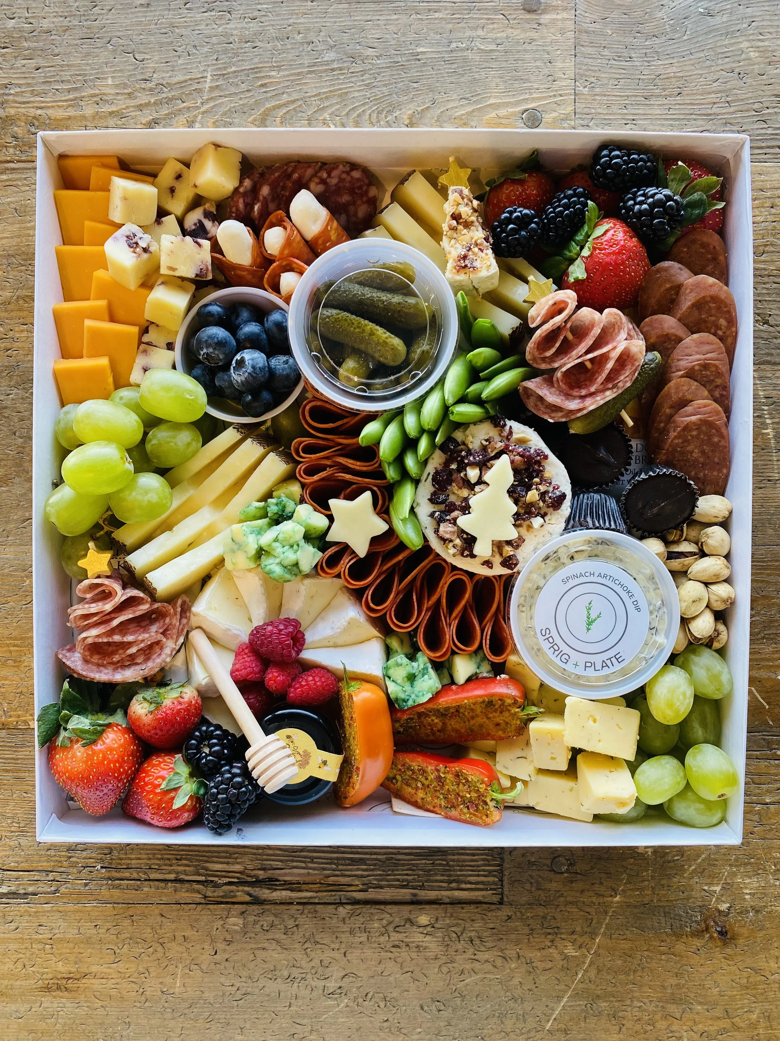 The pictures below are a general sample of what you can expect. Boards and boxes contain meat, cheese, fruit, and sweets. Chocolates are individually wrapped but may be manufactured in a facility with gluten. peanuts, and tree nuts.