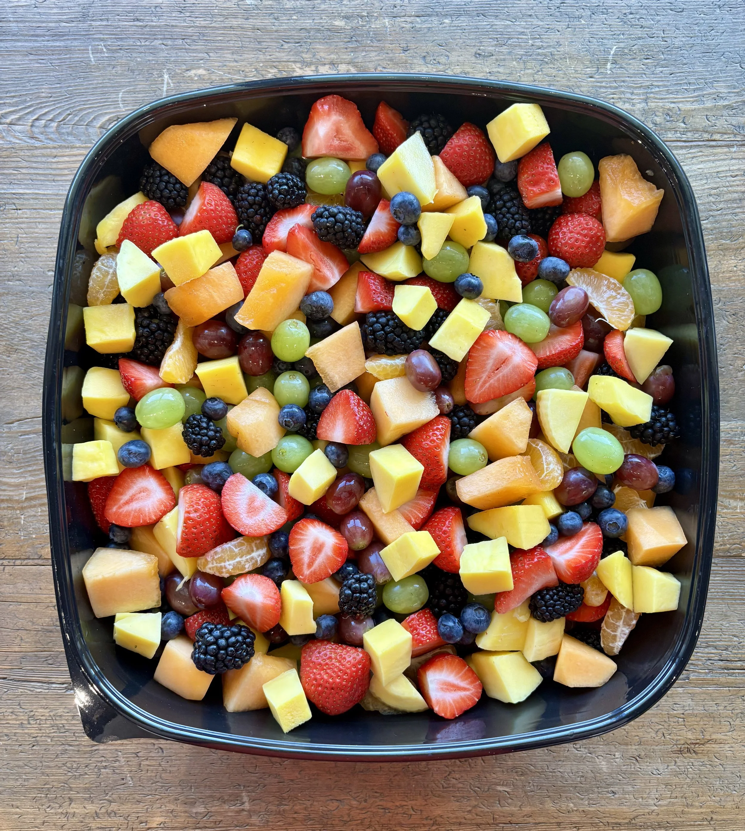 Mixed fruit salad includes a variety of seasonally available fresh berries and fruit, diced and ready to eat.