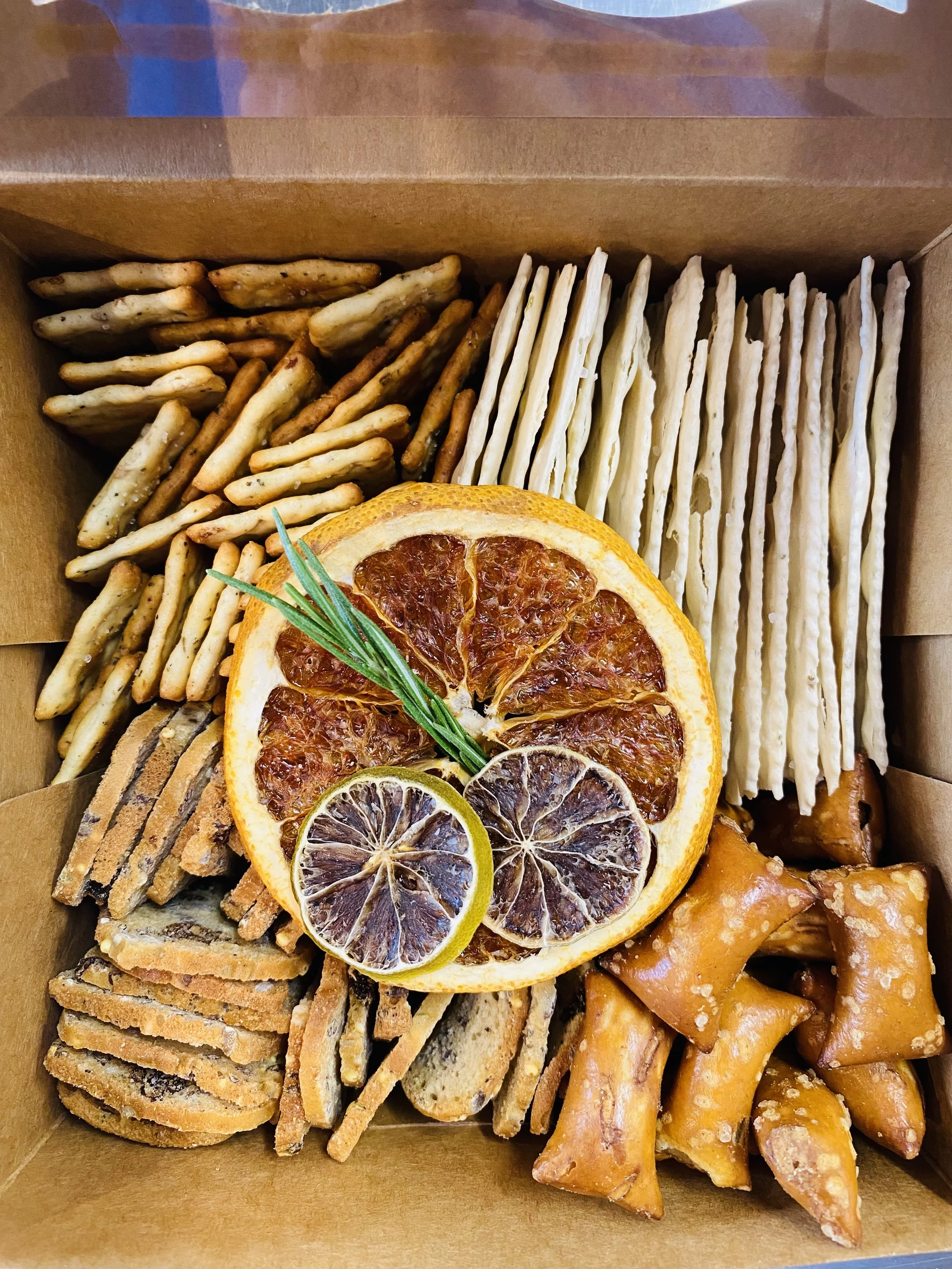 Add on a 6” cracker box to your next charcuterie order! This box includes a variety of crackers and pretzels and is a good add-on for our small or medium size charcuterie boards.